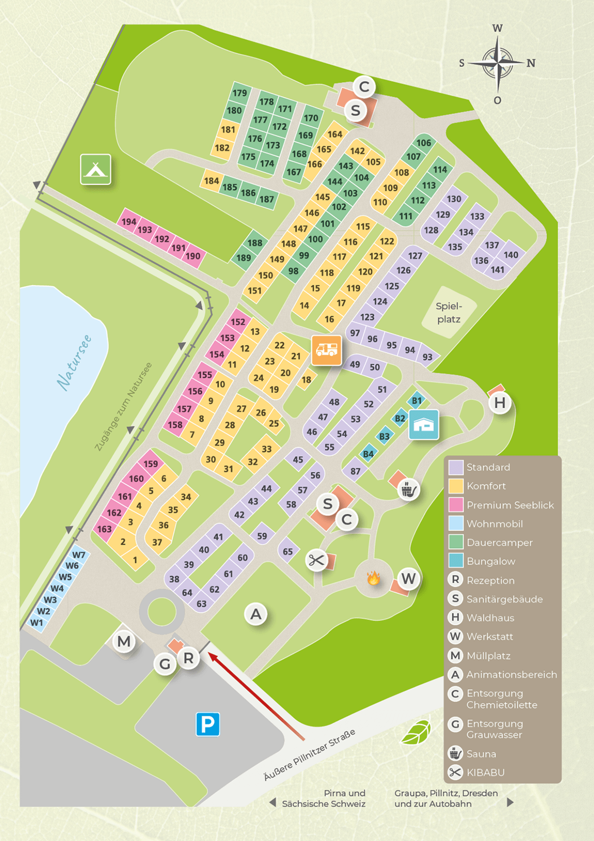 Hier erhalten Sie einen guten Überblick über unsere verschiedenen Stellplätze und Unterkünfte. Die Wege zu See und Sanitärgebäuden sind kurz, die Einfahrt ist ganz leicht zu finden.